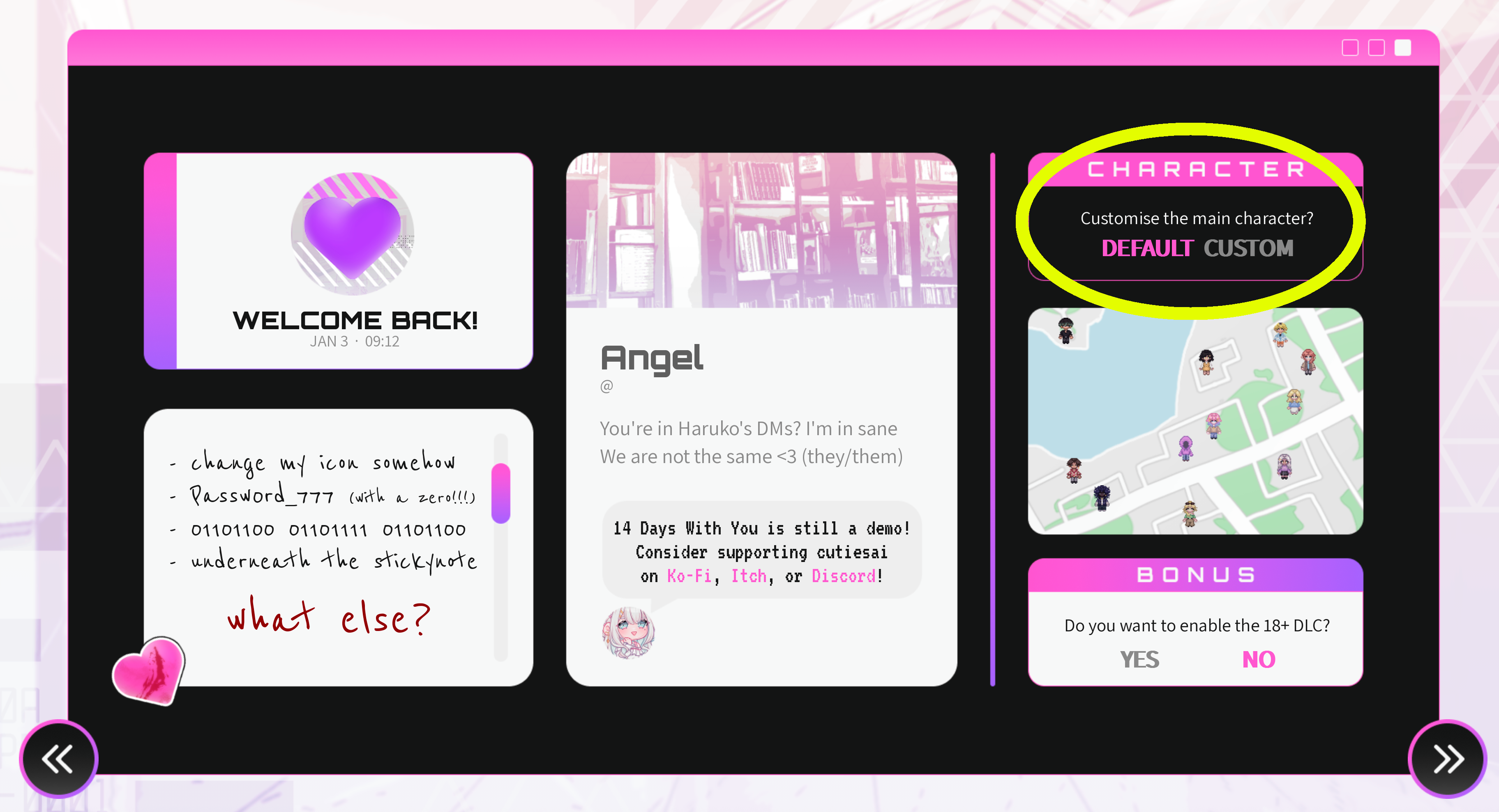 All NSFW content has been removed from the base game and turned into a separate DLC. If you have any questions or concerns regarding it, please ask them on the DLC's Itch page instead! This comment section is for 14DWY only!! Please understand that posting your DLC-related questions here will only confuse newer players who are interested in the base game or the 5.5 update.
